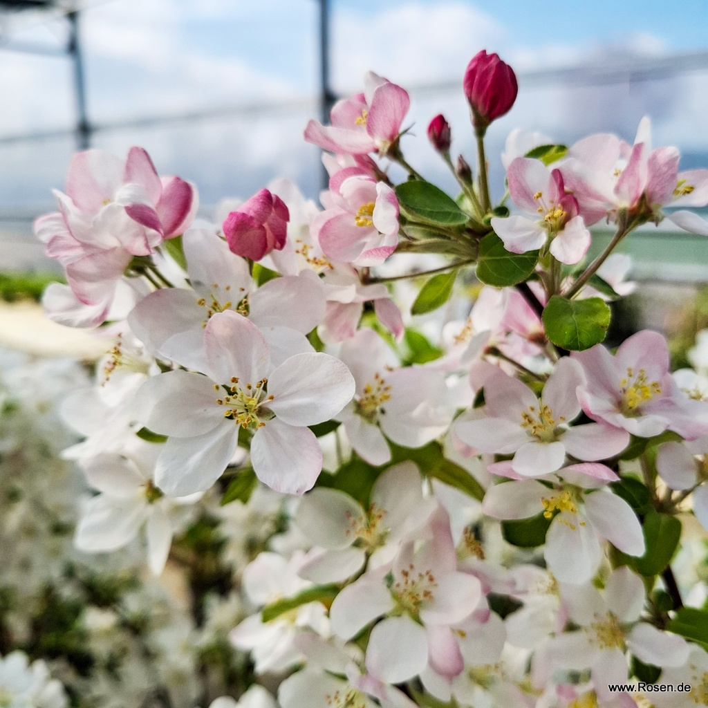 Wenn sich die roten Knospen des winterharten Zier-Apfels 'Evereste' im Mai zu weißen, zum Rand hin rosa gestreiften Blütenschalen öffnen, strömt ein herrlicher Duft durch den Garten. Seine Früchte, die im Sommer erscheinen, sehen zum Anbeißen aus, sind allerdings nicht wirklich genießbar (nur selten finden sie z. B. in Gelees Verwendung). Der attraktive Fruchtschmuck ist jedoch ein toller Hingucker im sommerlichen Garten und Malus 'Evereste' mit seinen insektenfreundlichen Blüten darüber hinaus ein hervorragender Pollenspender für Fruchtäpfel. Dieser Zier-Apfel empfiehlt sich für alle Gartenfreunde, die eine dekorative Pflanze ohne hohen Zeit- und Pflegeaufwand suchen, denn er zeigt sich ausgesprochen genügsam und pflegeleicht. Im normalen und lockeren Gartenboden fühlt sich das Gehölz gut aufgehoben und reagiert auch auf kurze Trockenperioden nicht empfindlich.