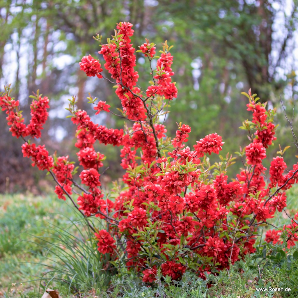 Die Zierquitte ‚Nicoline‘ ist ein besonders reich blühender, niedrig wachsender Zierstrauch mit breit ausladendem Wuchs. Im April und Mai schmücken große, schalenförmige Blüten in intensivem Karminrot die vorjährigen Triebe und machen sie zu einem echten Blickfang im Garten. Die dichte, stark verzweigte Krone eignet sich ideal zur Flächenbegrünung oder als dekorative Blütenhecke und bietet zugleich wertvollen Lebensraum für Vögel und Insekten. Im Herbst reifen gelbe, aromatische Früchte heran. Pflegeleicht, winterhart und vielseitig einsetzbar – ein echter Allrounder für naturnahe Gärten.