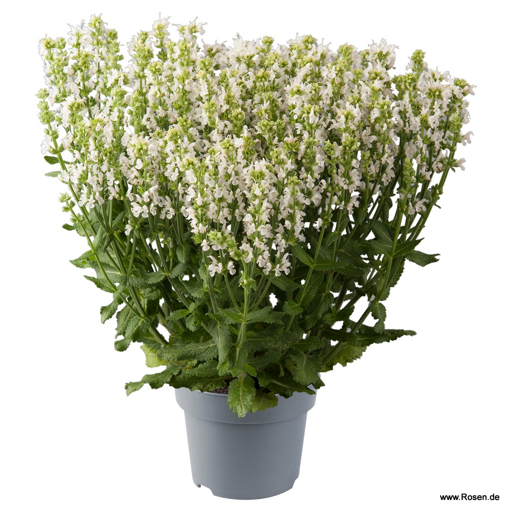 Eine kompakte, mehrjährige Pflanze mit dichten, aufrechten, ährenartigen Blütenständen in reinweißer Farbe. Die Blätter sind schmal, aromatisch und dunkelgrün. Sie zieht Bienen, Schmetterlinge und andere Bestäuber an. Der Ziersalbei ist sehr trockenheitsresistent und pflegeleicht. Eignet sich für Staudenbeete, ländliche und Präriebepflanzungen, an Wegrändern, in Steingärten und Kübeln. Die Staude bildet einen schönen Kontrast zu dunkelvioletten Salbeiarten, Lavendel, Sonnenhut und Ziergräsern. Nach der Blüte empfiehlt sich ein Rückschnitt, um die Nachblüte zu fördern. Vollständig frostbeständig. Weiße Blüten sind bei Salbeiarten relativ selten, weshalb die Sorte „Sensation Compact White“ eine elegante Ergänzung für helle und minimalistische Gartenkompositionen ist.