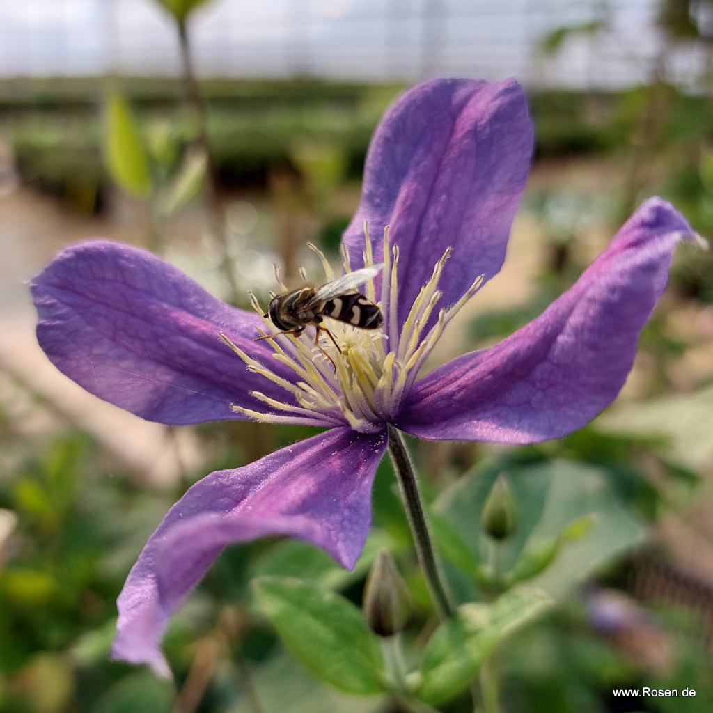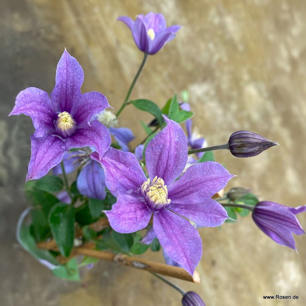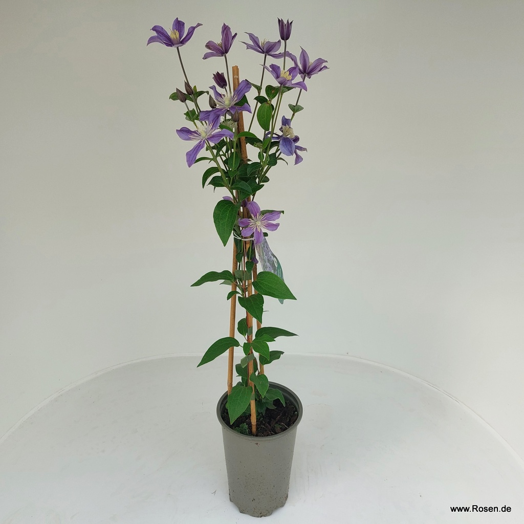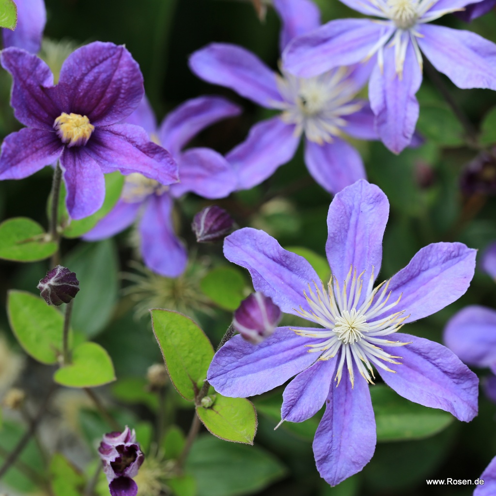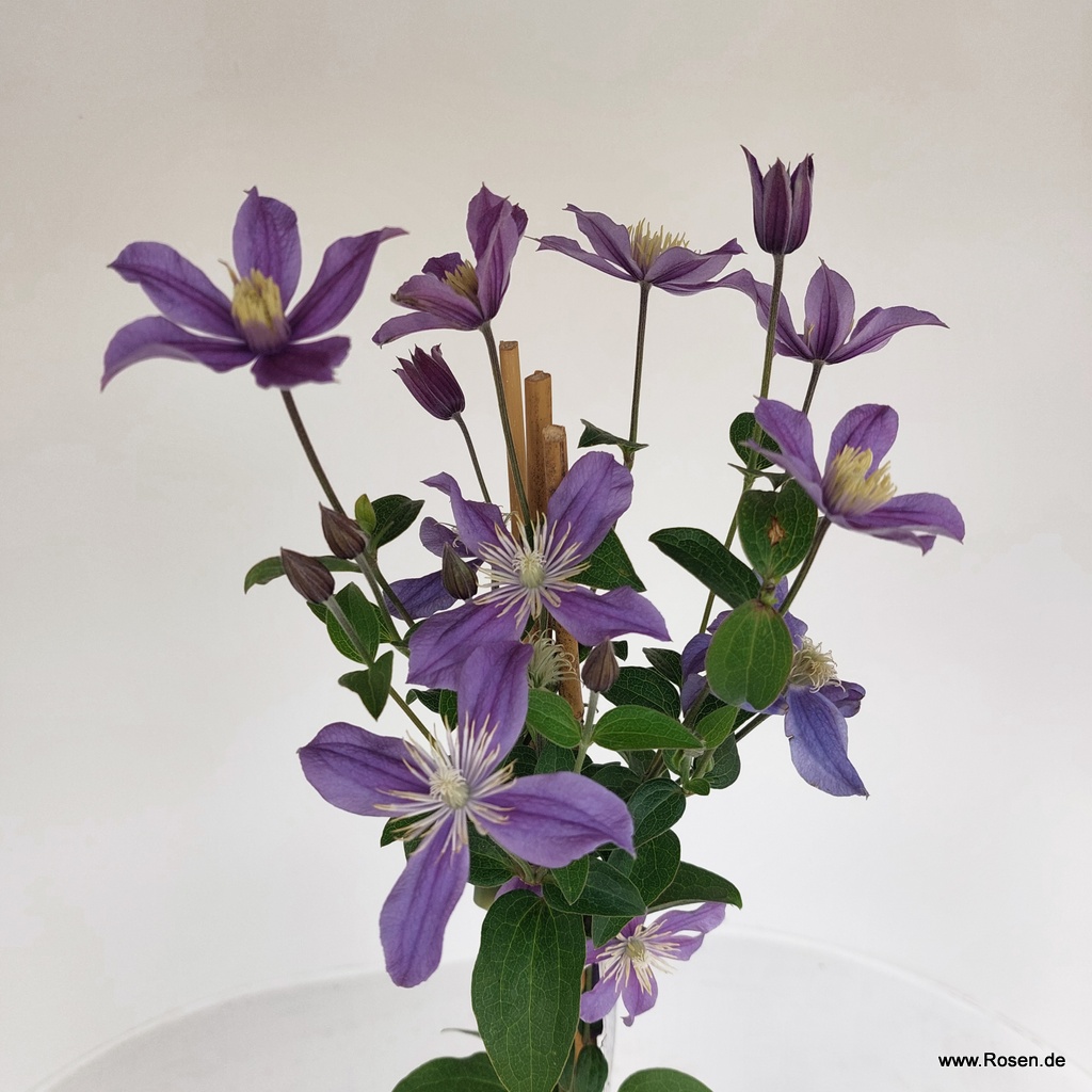 Die Clematis 'Arabella' erfreut mit einer wunderschönen, ausdauernden Blüte von Juni bis September mit einfachen blauen Blüten, die 6 bis 8 Zentimeter groß werden. Bei Sonne oder Halbschatten wächst sie bis zu 150 Zentimeter hoch. Rückschnitt auf 30 - 50 cm im März.