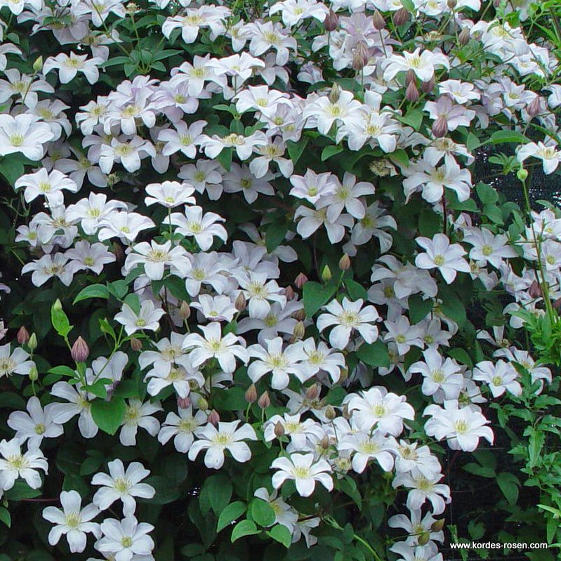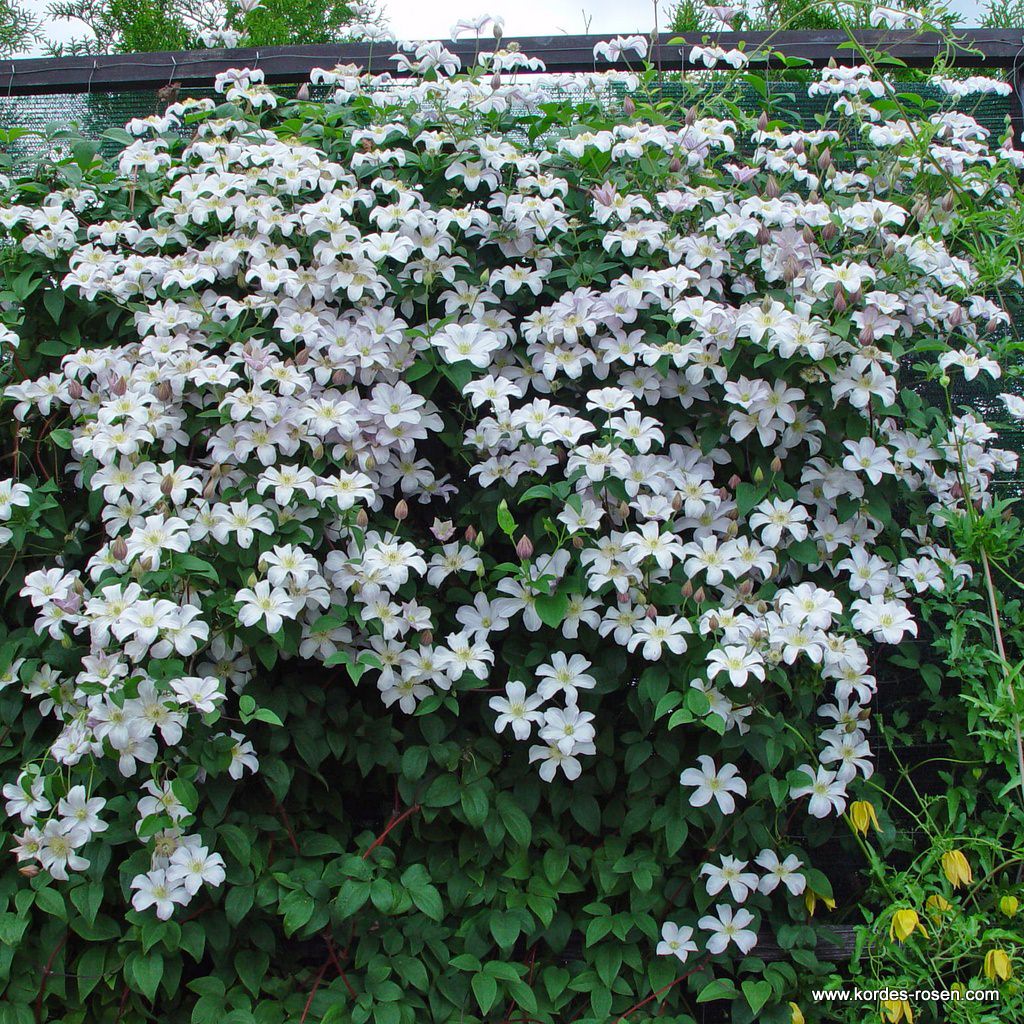 'Huldine' ist ein unkomplizierter Dauerblüher von Juli bis Oktober mit sehr dekorativen Blüten in einem schönen Perlmutt-Weiß mit grünlichen Staubgefäßen. An einem sonnigen bis halbschattigen Standort klettert sie etwa 3 - 5 m hoch. Guter Rosenpartner.