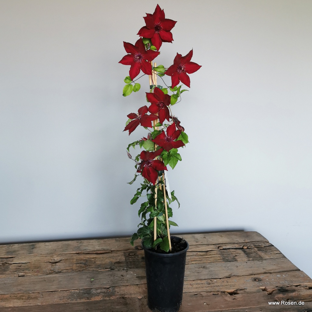 Atemberaubende dunkelrote Neuheit aus dem Hause Evison. 'Nubia' hat edle Blüten (ca. 8-9 cm) und ist mit ihrer Wuchshöhe von 1,2- 1,8 m ideal zur Kübelbepflanzung geeignet.