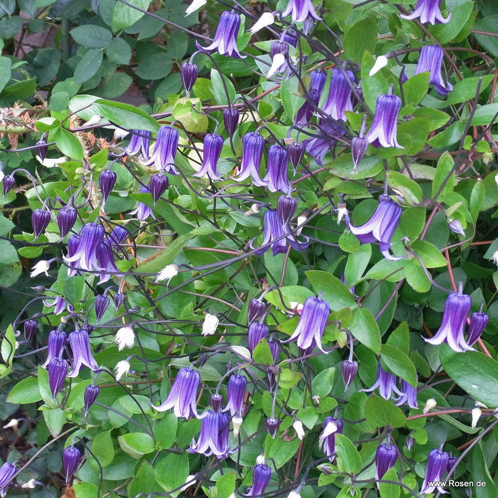 Das Blütenkleid dieser Clematis ist ein Traum! Sehr schöne dunkelblauviolette Glöcken nicken mit weißlich gefärbten Säumen dem Betrachter zu. Gerne teilt sie sich mit Rosen ein Rankgerüst und erreicht dabei eine Höhe von 2 m.