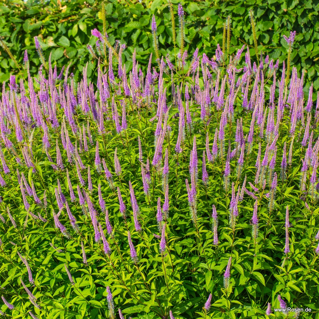 Eine wirkliche Faszination geht vom Kandelaber-Ehrenpreis 'Fascination' aus, denn die winterharte, bis zu 170 cm in die Höhe wachsende Staude beeindruckt nicht nur durch ihren imposanten Wuchs, sondern ebenso durch ihre ährenförmigen, rosaviolettfarbenen Blüten, die die Pflanze den ganzen Sommer zieren. Veronicastrum virginicum 'Fascination' ist horstbildend und sollte daher mit ausreichend großem Pflanzabstand von ca. 90 cm gepflanzt werden. Der Standort sollte dabei sonnig bis halbschattig sein.