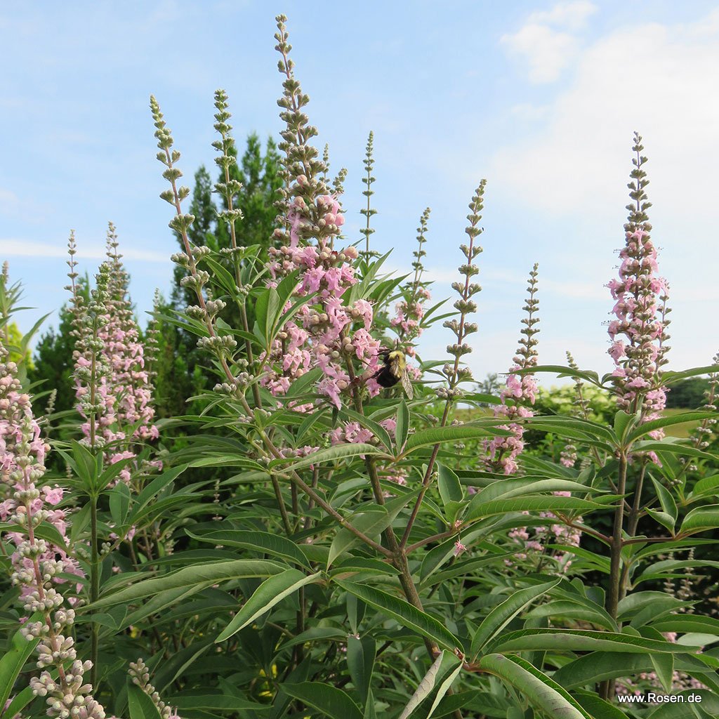 Am besten gedeiht der Mönchspfeffer an einem sonnigen, warmen und geschützten Standort in durchlässigem, eher trockenem bis frischem Boden. Ist er gut eingewachsen, zeigt er sich robust, hitze- und trockenheitsverträglich sowie insgesamt sehr pflegeleicht. Ein Rückschnitt im Frühjahr fördert einen kompakten Wuchs und eine besonders reiche Blütenbildung. In raueren Lagen kann ein leichter Winterschutz sinnvoll sein, da junge Pflanzen etwas empfindlicher auf starken Frost reagieren. Dank seiner luftigen Blüten und seines natürlichen Wuchses eignet sich ‘Galactic Pink’ ideal für sonnige Gärten, mediterrane Pflanzungen, Naturgärten und größere Kübel. Zudem ist er eine wertvolle Bienen- und Insektenpflanze und bringt über viele Wochen hinweg Farbe und Leben in den sommerlichen Garten.