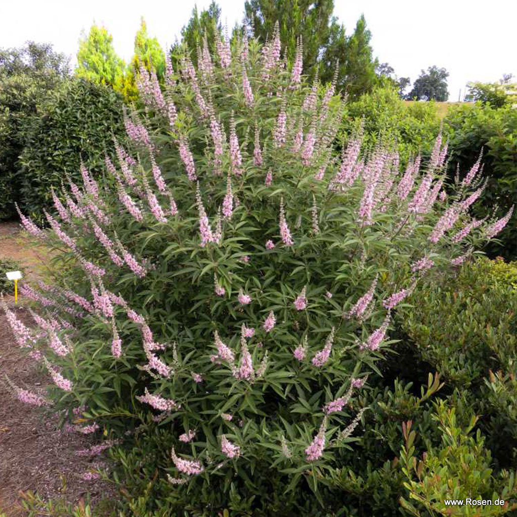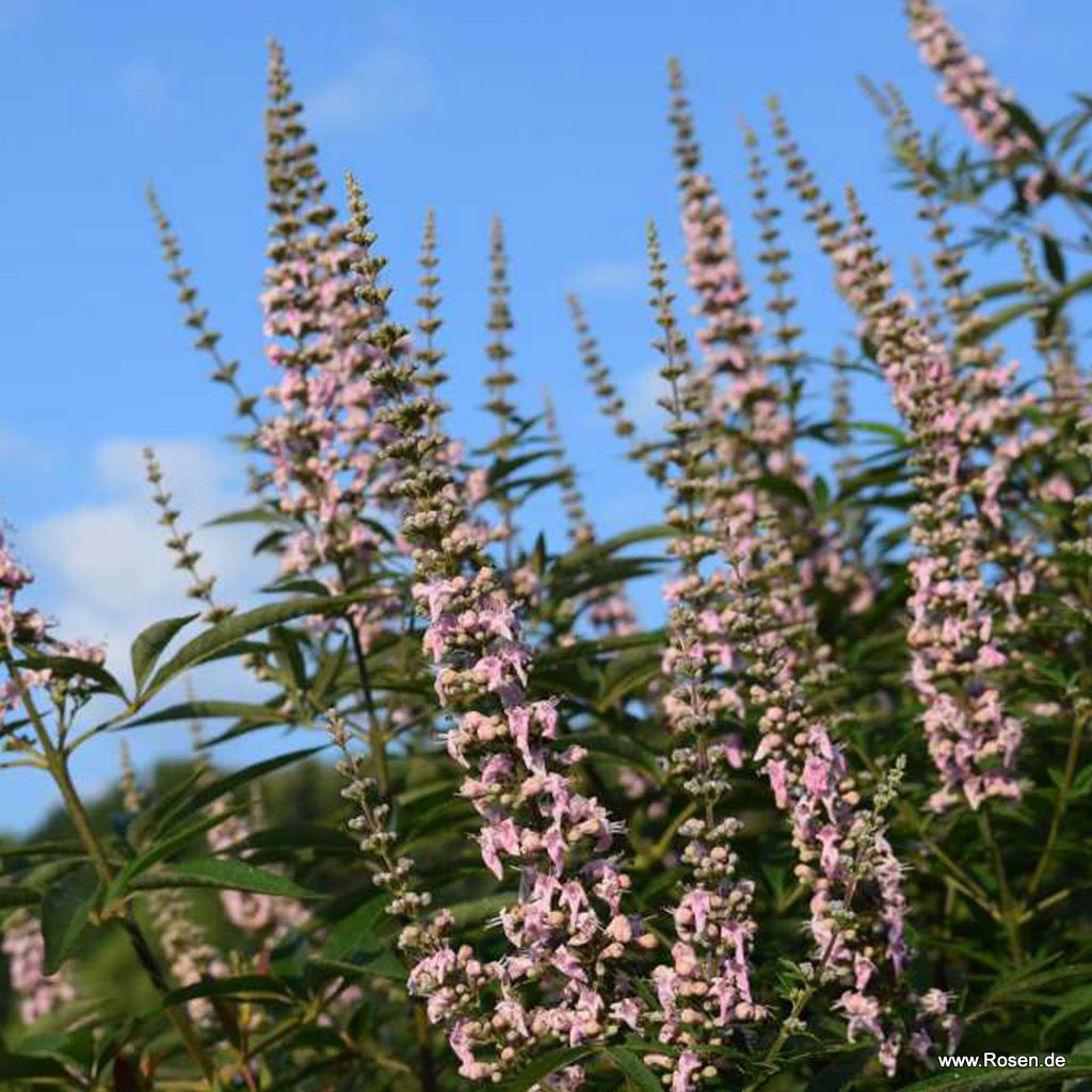 Der Mönchspfeffer Vitex agnus-castus 'Galactic Pink' ist ein dekorativer, sommerblühender Zierstrauch, der mit seinen eleganten Blüten und seinem mediterranen Charakter begeistert. Von Juli bis September erscheinen zahlreiche, aufrechte Blütenrispen in einem zarten bis kräftigen Rosa, die einen angenehmen Kontrast zum aromatischen Laub bilden und dem Garten eine leichte, sommerliche Ausstrahlung verleihen. Die Sorte wächst locker aufrecht, buschig und gut verzweigt und erreicht unter mitteleuropäischen Bedingungen eine Wuchshöhe von etwa 150 bis 250 cm sowie eine Breite von rund 100 bis 200 cm. Die handförmig geteilten, graugrünen Blätter erinnern optisch an Hanflaub und verströmen bei Berührung einen aromatischen Duft.