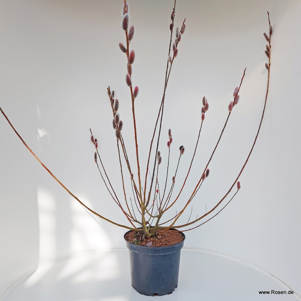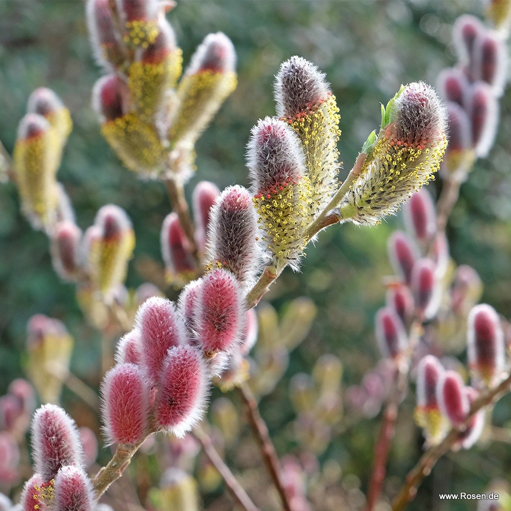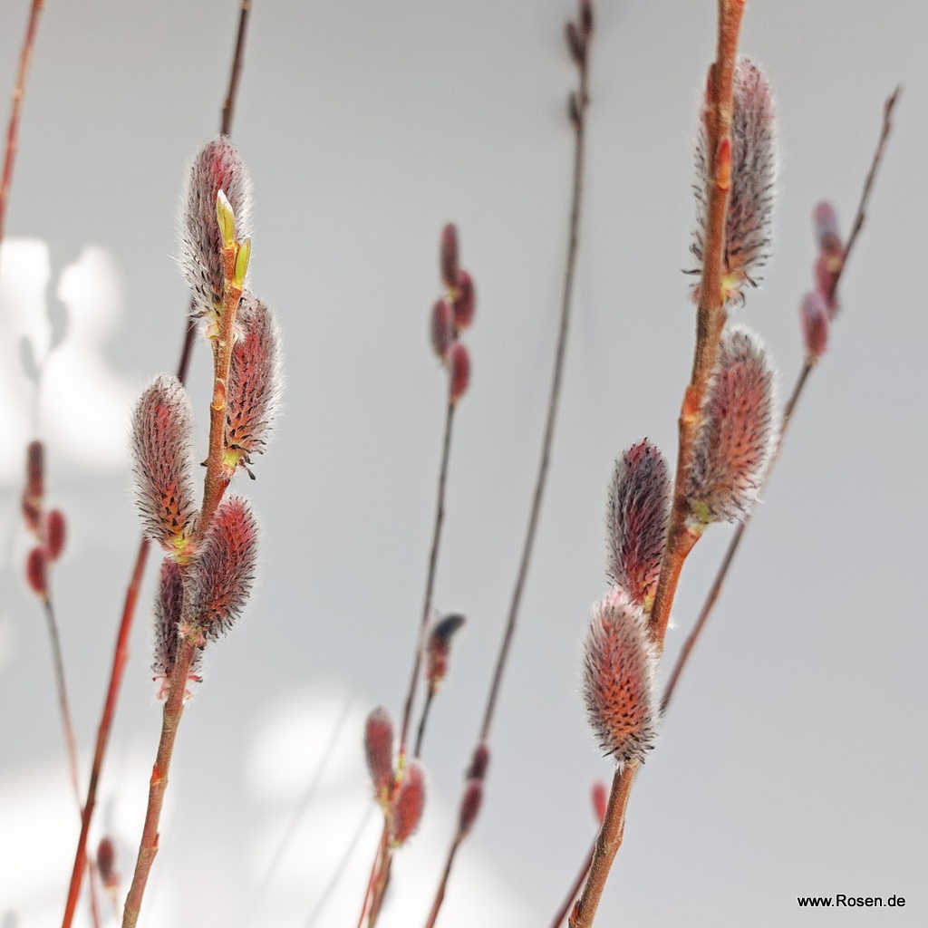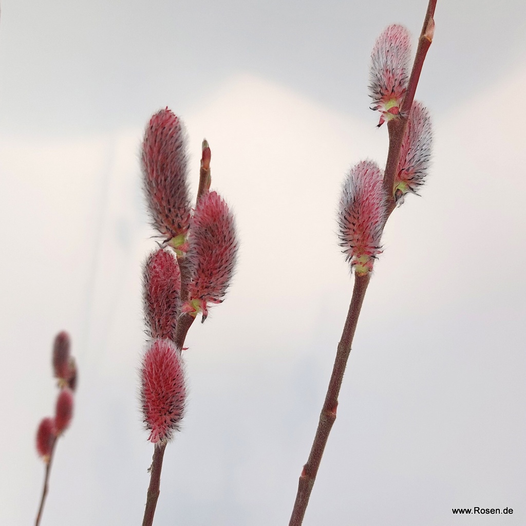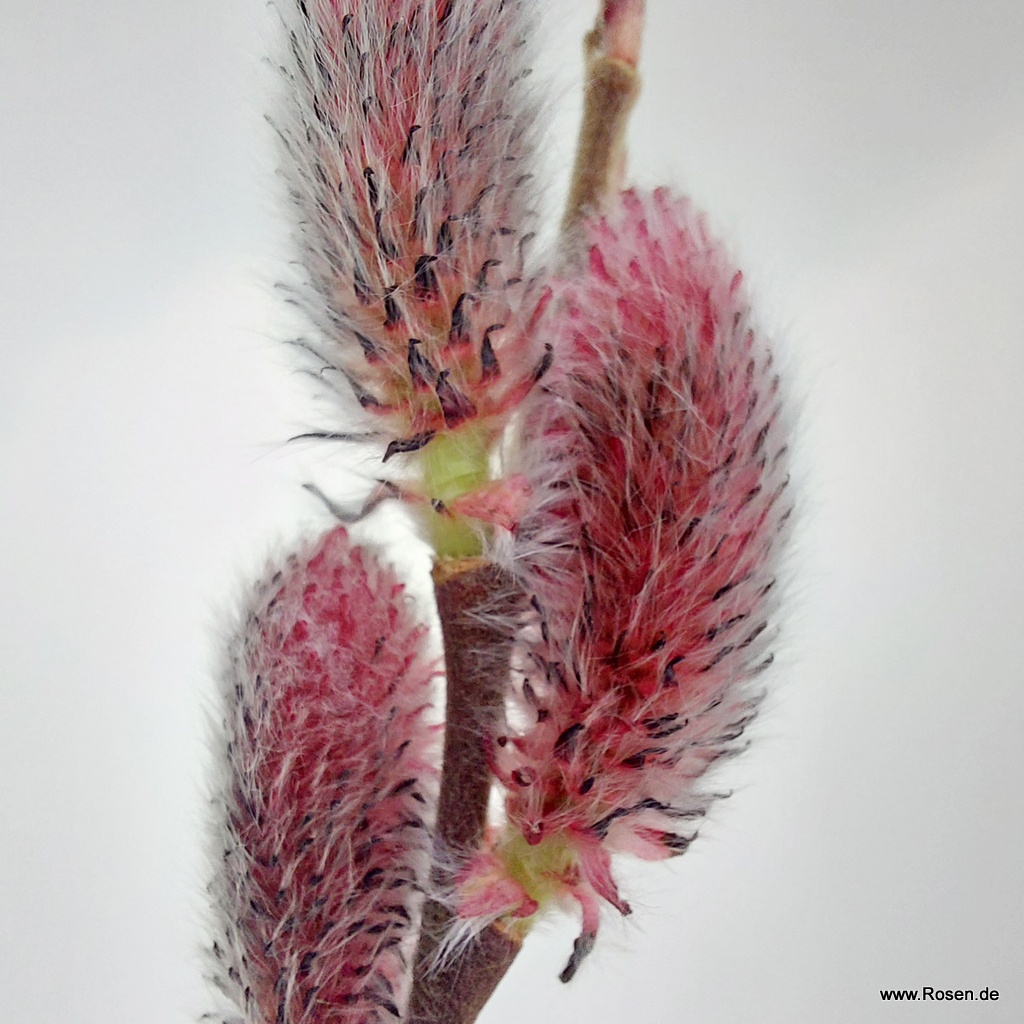 Die rosa Riesen-Salweide 'Mount Aso' setzt Akzente in Ihrem Garten. Sie hat einen meist mehrstämmigen Wuchs (strauchartig) und ist winterhart. Ihre großen, weißlich behaarten rosa Kätzchen passen hervorragend zu den elliptisch, eiförmigen Blättern. Salix gracilistyla 'Mount Aso' kann sowohl auf sandigem, als auch in feuchtem Böden wachsen. Zudem gilt sie als äußerst salztolerant. Ihr recht anspruchsloses Wesen lässt sie für die unterschiedlichsten Plätze im Garten in Frage kommen. Sonnige bis halbschattige Lagen sind ideal für sie.