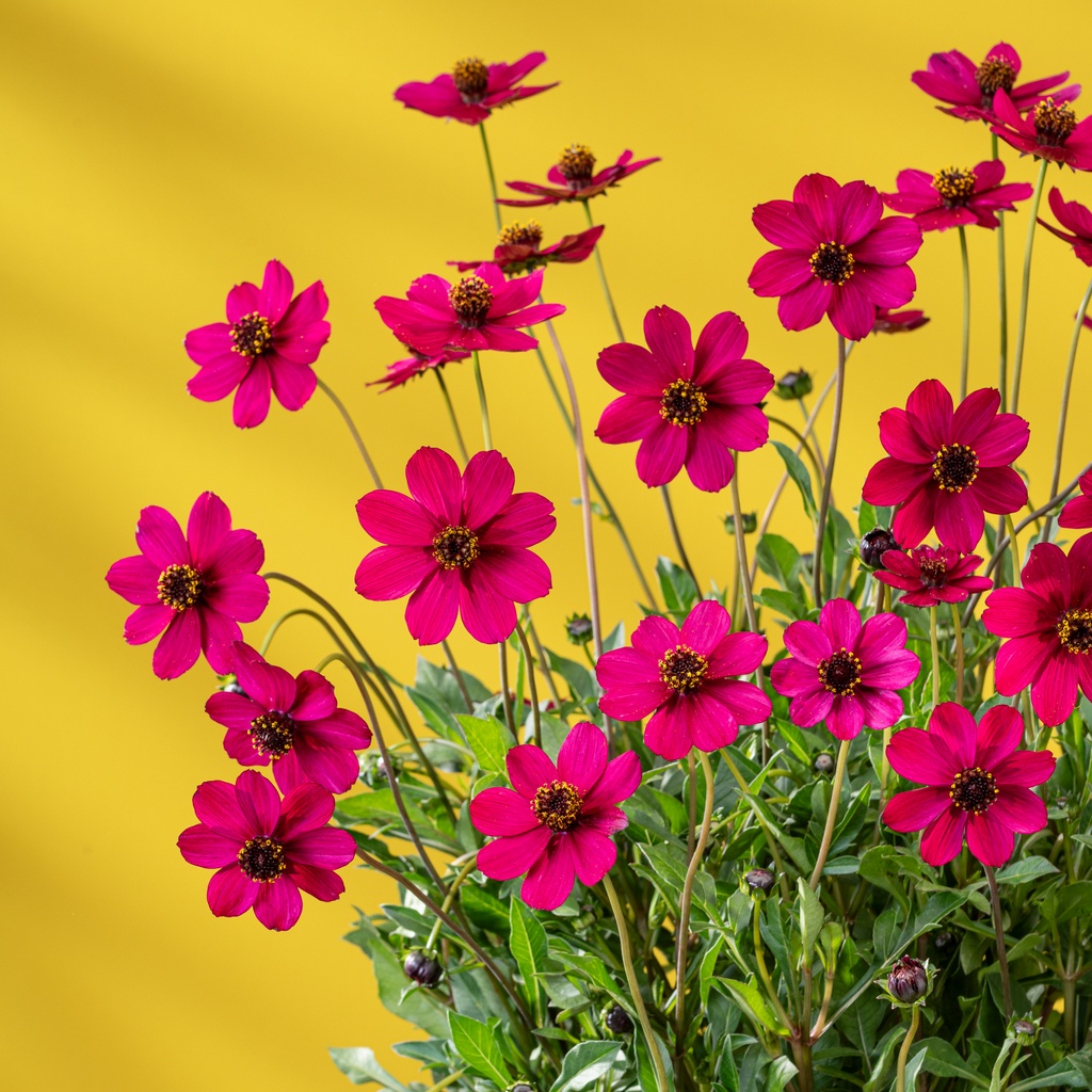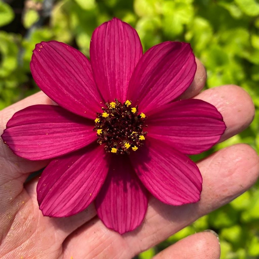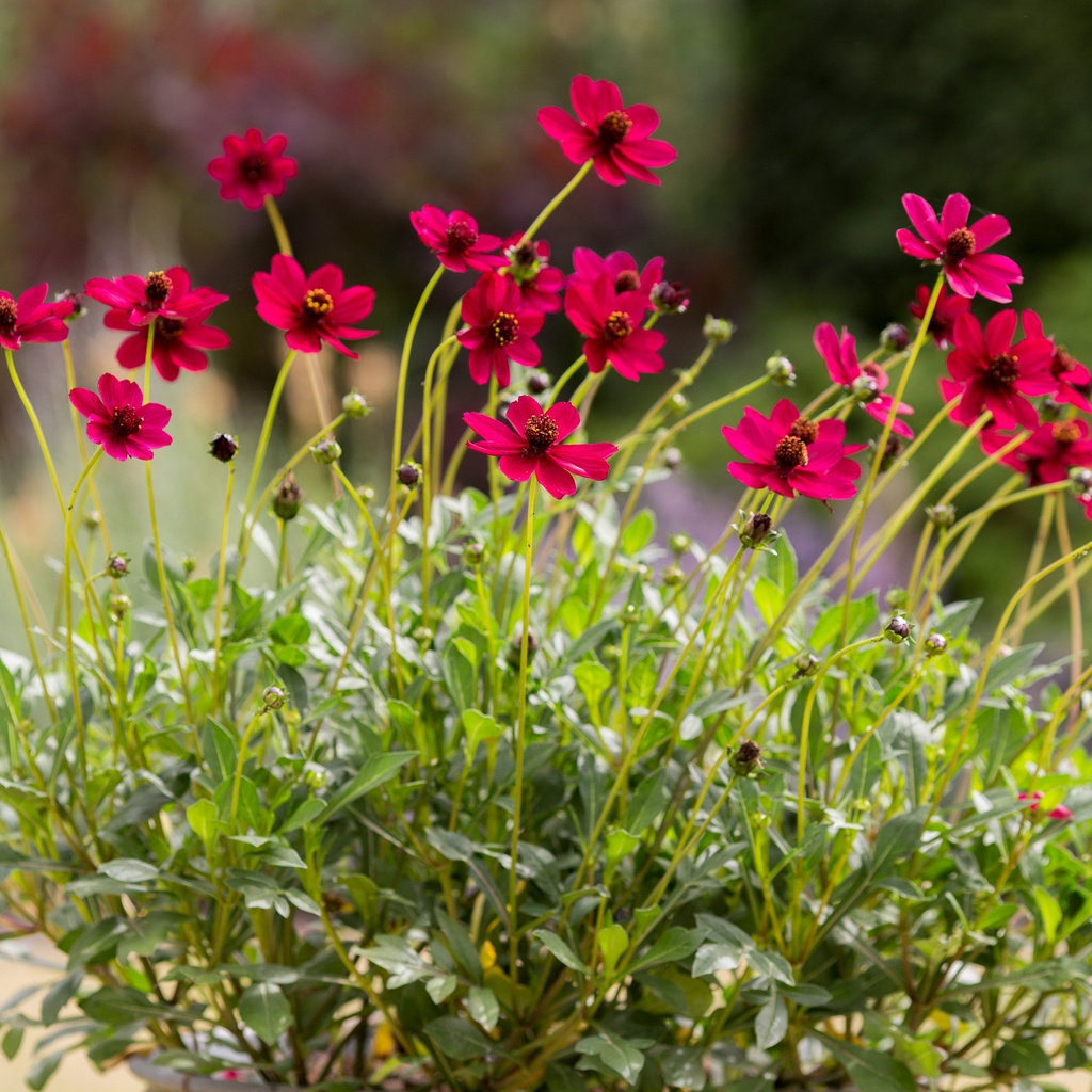 Die Schokoladenblume 'Cherry Chocolate' besticht mit deutlich größeren Blüten als andere Schokoladenblumen und mit neuem Farbton: Die kirschroten, nach Schokolade duftenden Blüten werden bis zu 7 cm groß. Cosmos atrosanguineus 'Cherry Chocolate' wächst kompakter als andere Sorten und hat kürzere Blütenstiele, sodass die Blüten dichter über dem Laub sitzen. Die winterharte Staude ist bienenfreundlichen, liebt einen sonnigen bis halbschattigen Standort und wird ca. 45 cm hoch. Der Boden sollte humos und durchlässigen sein. Während der Wachstumsperiode sind regelmäßige Wasser- und Düngergaben ratsam.