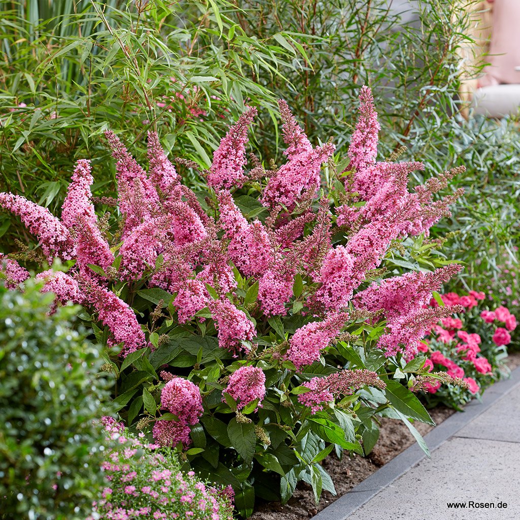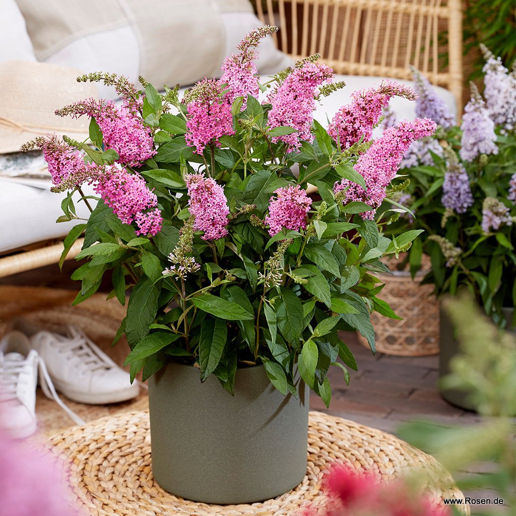 Buddleja davidii ´Butterfly Candy® Little Pink´: Miniatur-Buddleja aus der Candy Collection-Serie. Wuchs dicht verzweigt, kompakt-aufrecht, bis 80 cm hoch und breit; Blätter silbergrün; Blüten kräftig rosa, zahlreich, in aufrechten Rispen, Juni bis September, durch Herausnehmen welker Blüten bilden sich laufend neue Blütenrispen - eine robuste, winterharte, pflegleichte Zwerg-Buddleja, gut geeignet für kleine Hecken, in Pflanzgefäßen auf Balkon und Terrasse. Sehr attraktiv für Schmetterlinge und Bienen. Dies macht die Butterfly Candy-Serie ideal für die Artenvielfalt.