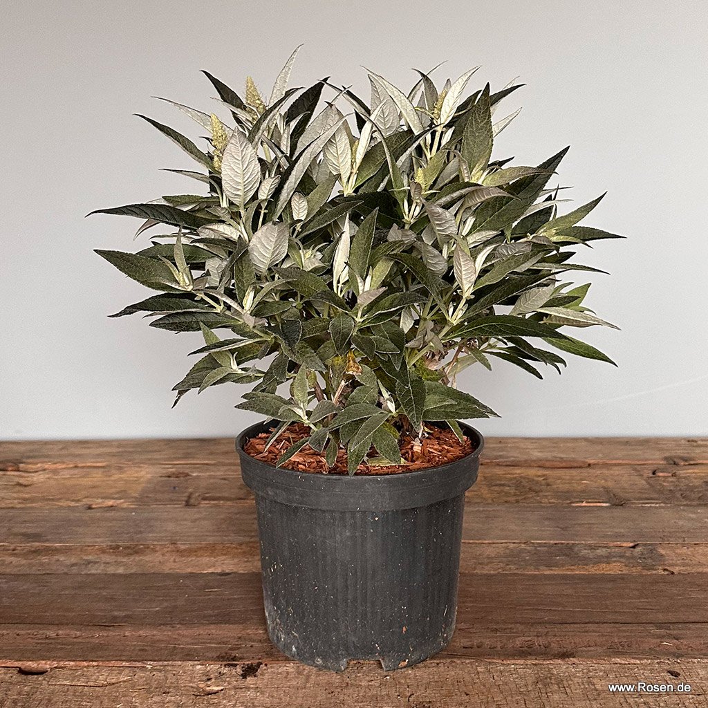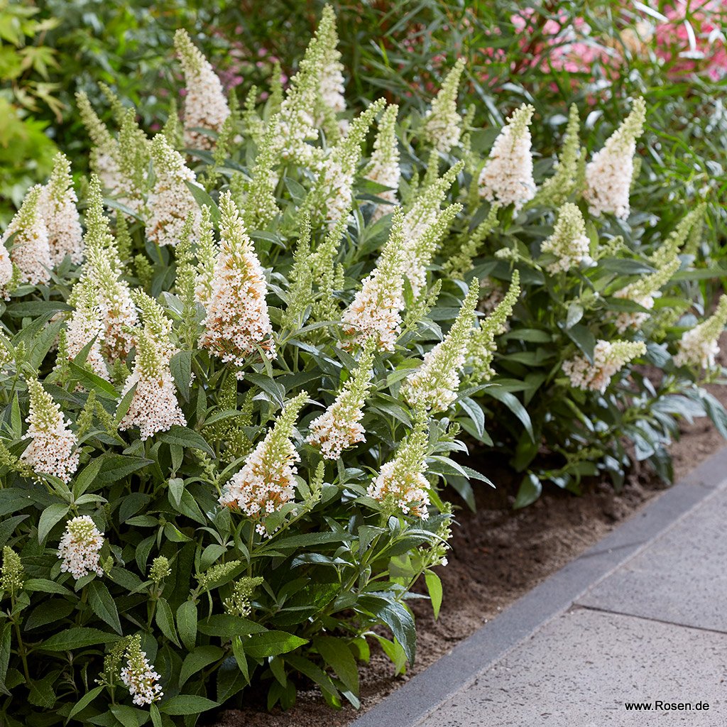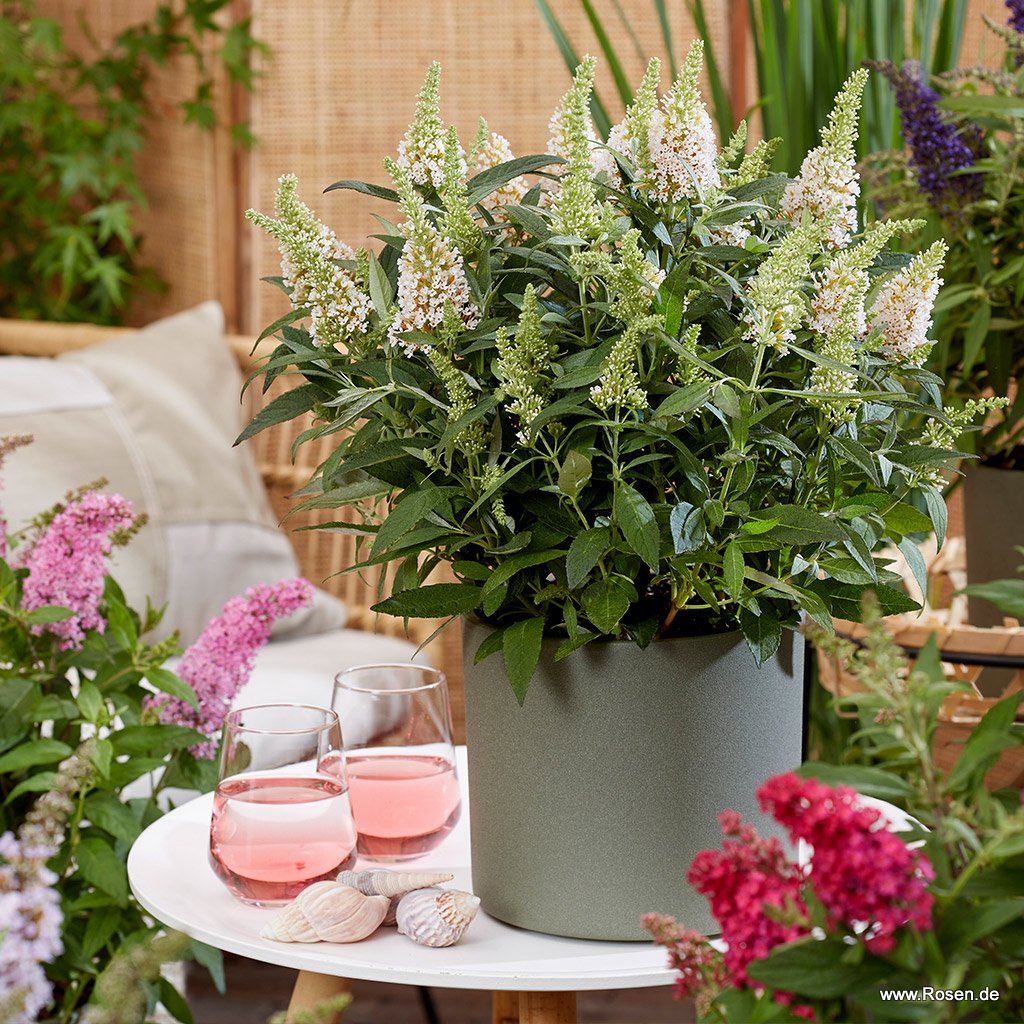 Buddleja davidii ´Butterfly Candy® Little White´: Miniatur-Buddleja aus der Candy Collection-Serie. Wuchs dicht verzweigt, kompakt-aufrecht, bis 80 cm hoch und breit; Blätter silbergrün; Blüten weiß, zahlreich, in aufrechten Rispen, Juni bis September, durch Herausnehmen welker Blüten bilden sich laufend neue Blütenrispen - eine robuste, winterharte, pflegleichte Zwerg-Buddleja, gut geeignet für kleine Hecken, in Pflanzgefäßen auf Balkon und Terrasse. Sehr attraktiv für Schmetterlinge und Bienen. Dies macht die Butterfly Candy-Serie ideal für die Artenvielfalt.