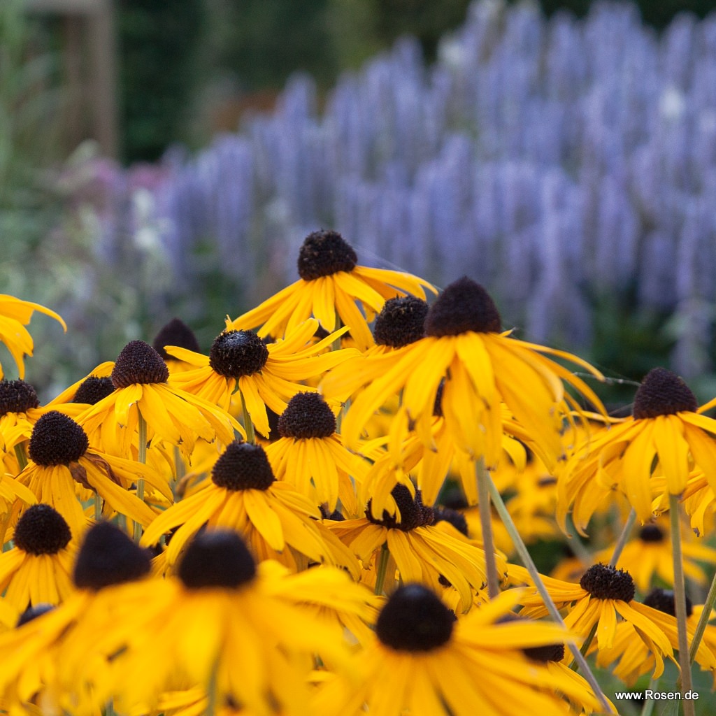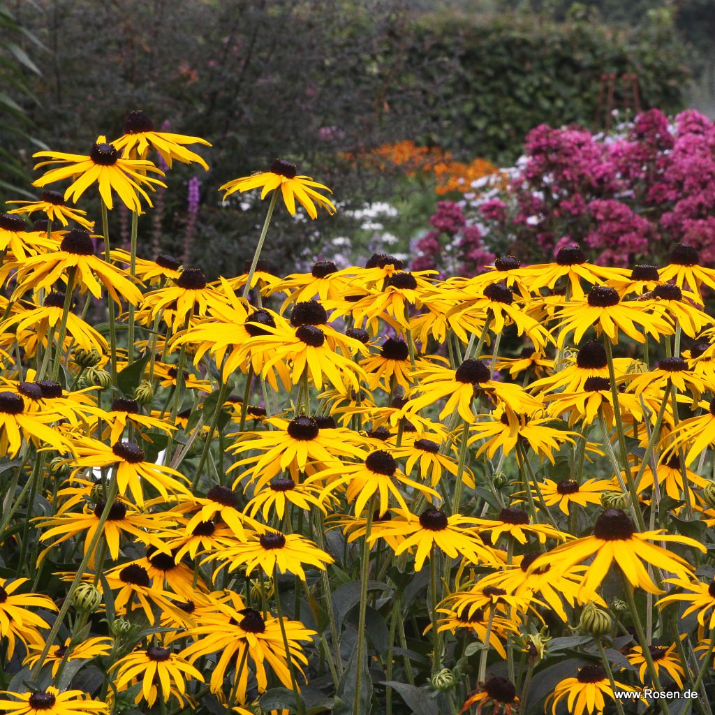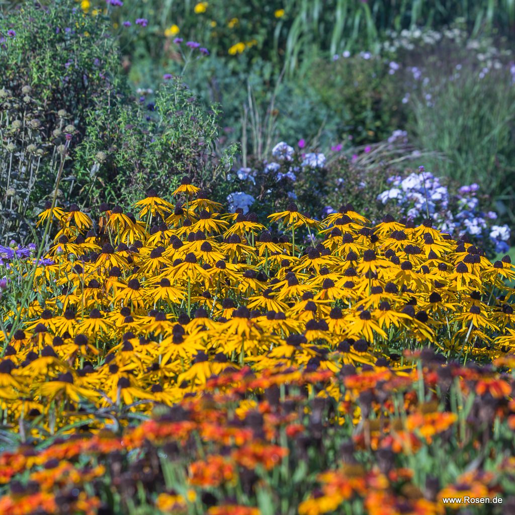 Der Sonnenhut 'Goldsturm' hat große goldgelbe Blüten mit dunkler Mitte und einen kräftigen, aufrechten und horstbildenden Wuchs. Er liebt einen sonnigen Standort und einen gleichmäßig frischen sowie nährstoffreichen Boden. Rudbeckia fulgida var. sullivantii 'Goldsturm' ist ein Klassiker im Bauerngarten, überzeugt aber auch im Staudenbeet und in Rabatten mit seinen großen Blüten und der langen Blühdauer vom Spätsommer bis in den Herbst hinein. Der Sonnenhut ist eine wichtige Insektenweide und eignet sich auch als Schnitt- und Trockenblume.