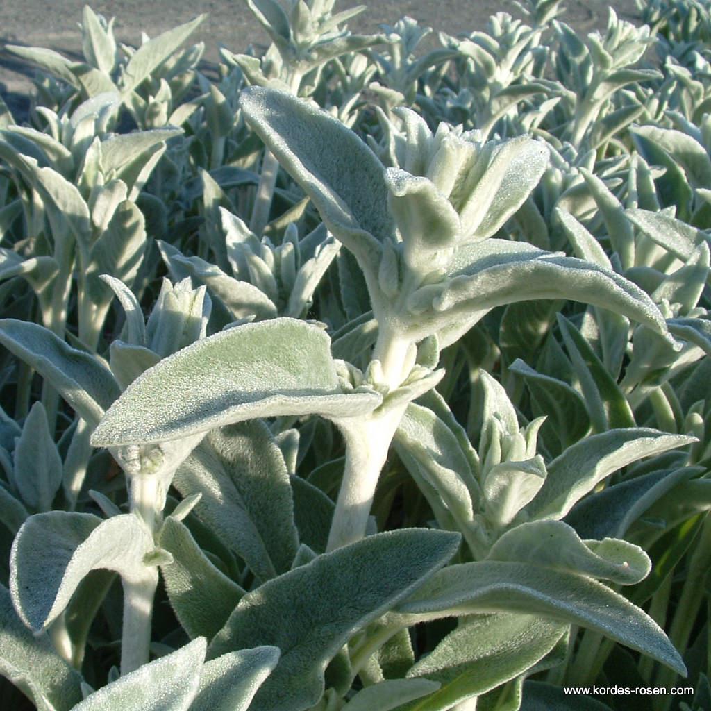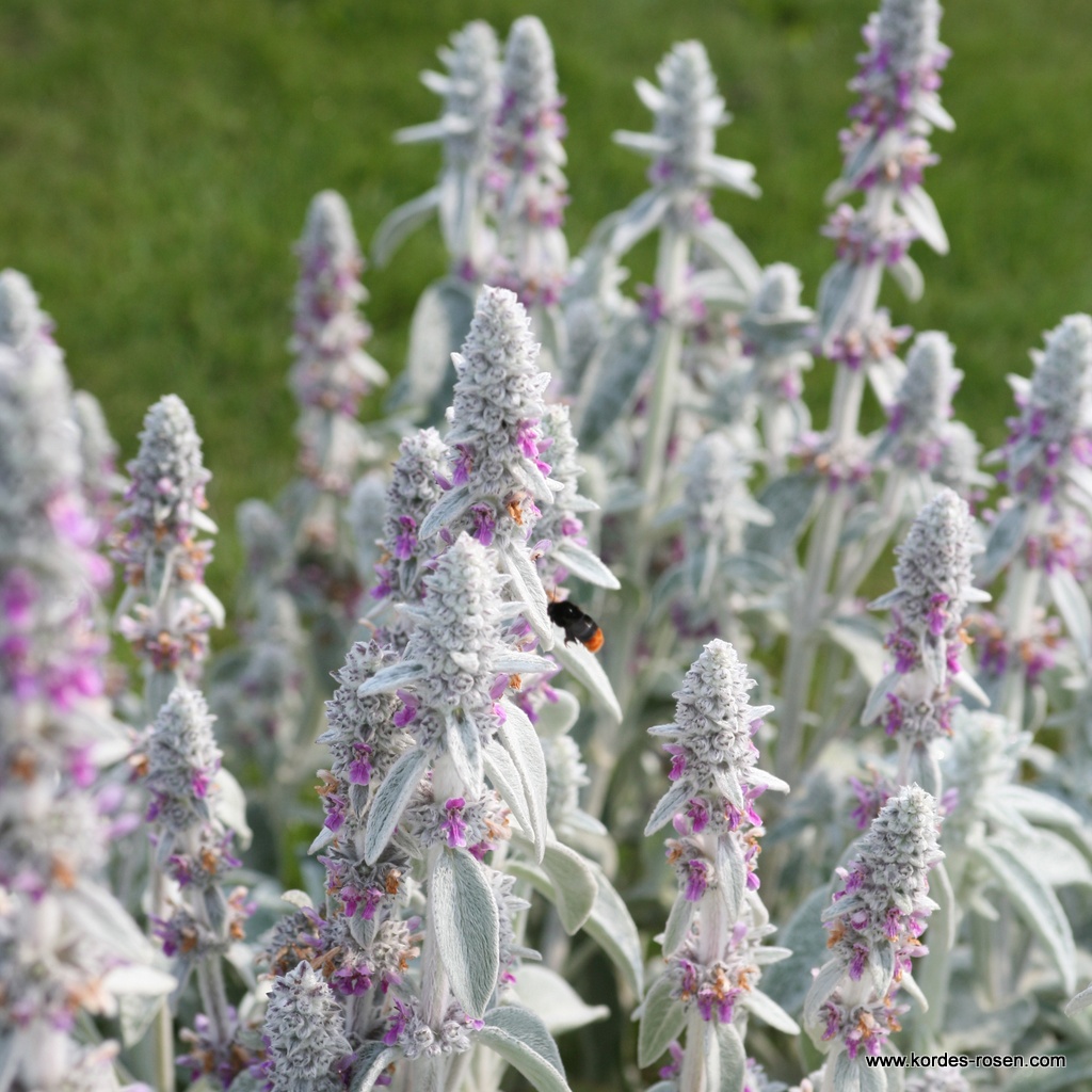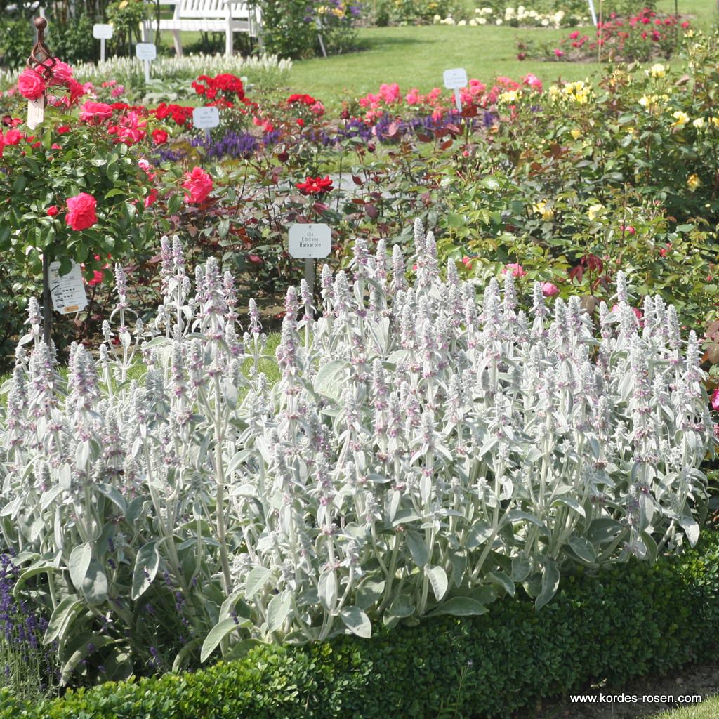 Der Teppich-Wollziest kann mit seinen behaarten, silbrig glänzenden Blättern eine tolle Kombination mit anderen Stauden und Rosen eingehen. Die Blütenfarben scheinen vor der hellgrauen Kulisse zu leuchten. Er unterdrückt Unkraut und kann sogar verhindern, dass Rasen in die Beete einwächst.