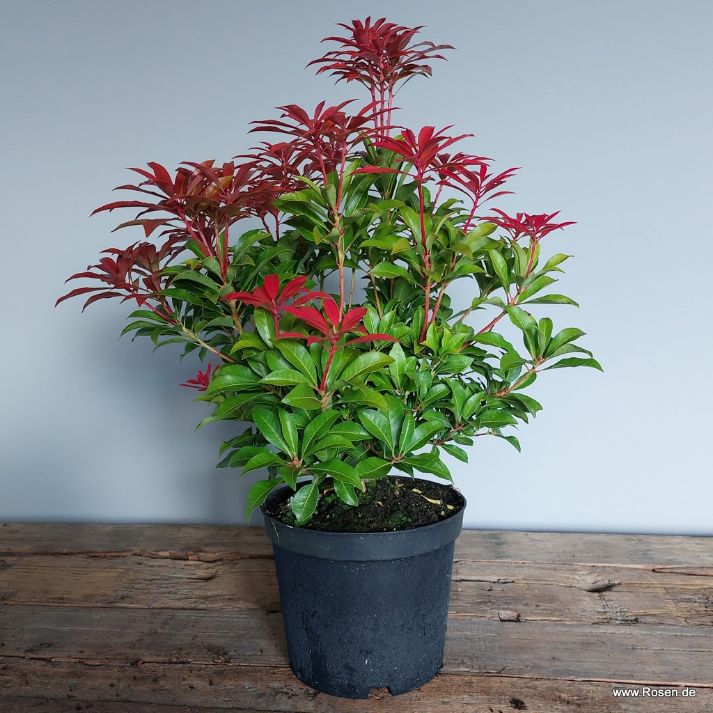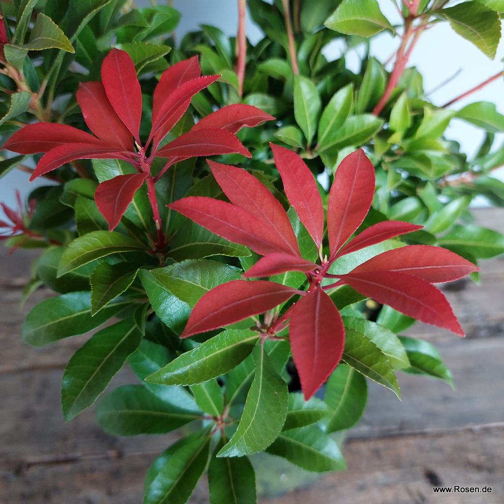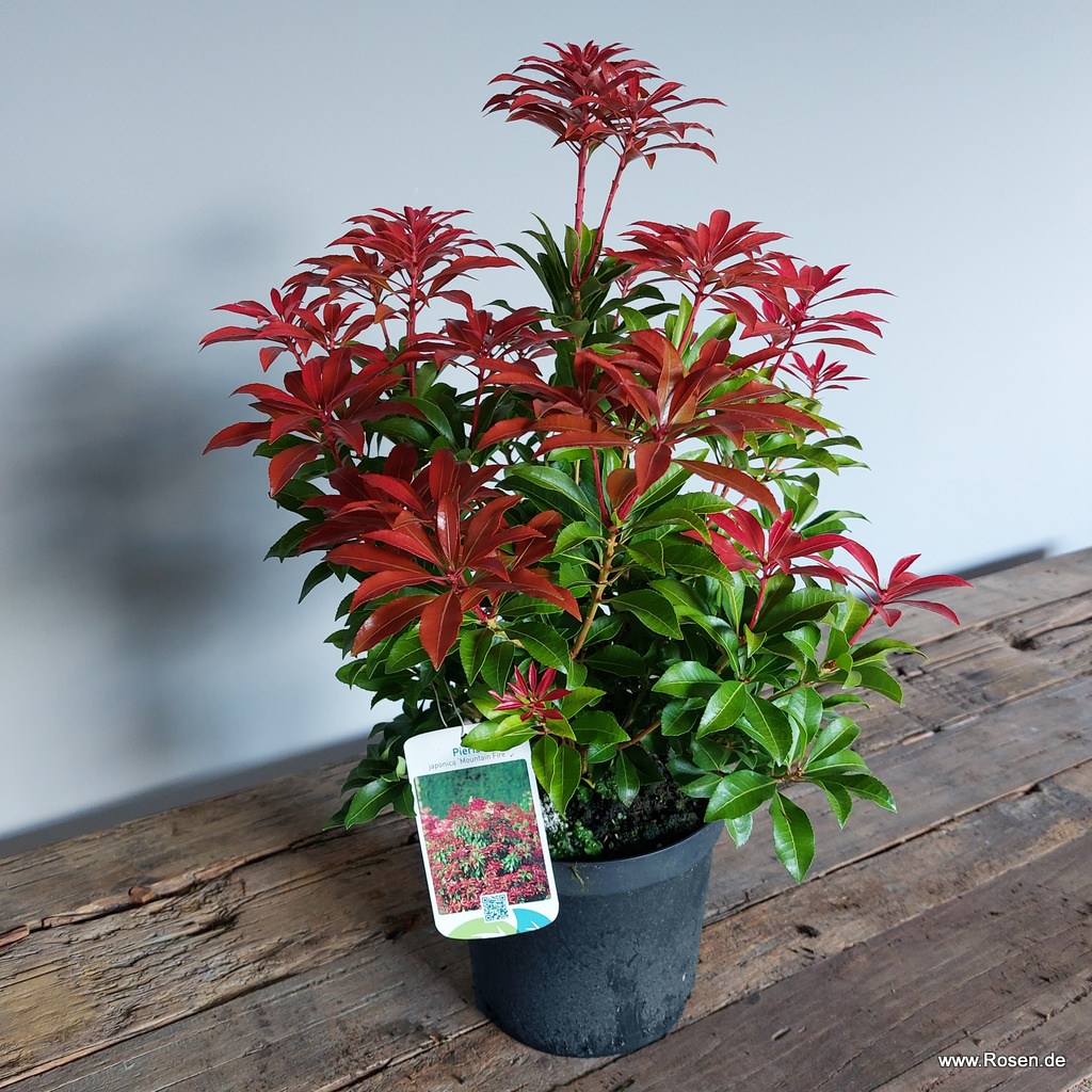 Das wohl auffälligste und namengebende Merkmal des Schattenglöckchens 'Mountain Fire' ist wohl sein intensiv rot gefärbter Neuaustrieb, mit dem sich der Strauch im Frühjahr schmückt und der einen bezaubernden Kontrast zum Dunkelgrün des "alten" Laubes bildet. Ende März erscheinen dann unzählige weiße Blüten in dichten Rispen, die Pieris japonica 'Mountain Fire' zusätzlich zieren. Der immergrüne und breitbuschig wachsende Zierstrauch, der eine stattliche Wuchshöhe von bis zu 160 cm erreicht, bevorzugt einen sonnigen bis halbschattigen Standort und ist in Moorbeeten neben Rhododendren, Azaleen & Co. bestens aufgehoben.