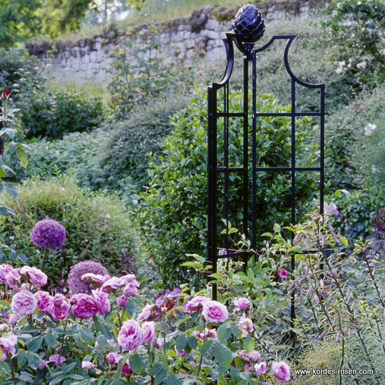 Für kleine Gärten sind Obelisken ein Geschenk des Himmels.Sie zaubern bei geringstem Platzbedarf eine zusätzliche duftende Dimension. Solche Schönheiten benötigen einen festen Stand. Eine Verankerung im Betonpfropfen ist allerdings nur für besonders windexponierte Lagen sowie bei der Bepflanzung mit kräftig wachsenden Kletter- oder Strauchrosen erforderlich.